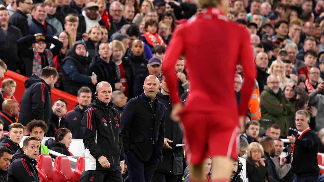 A baffled Arne Slot looks at Hugo Ekitike, who got a second yellow for taking his shirt off after scoring a winner against Championship club Southampton. We think it’s funny. The rest of the world did not.